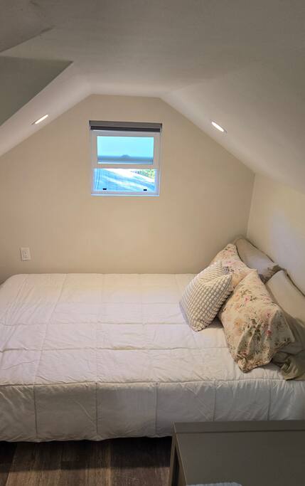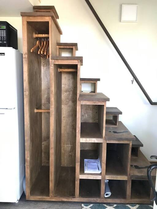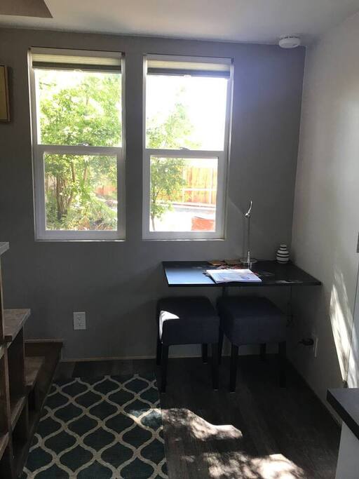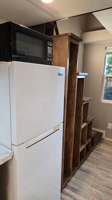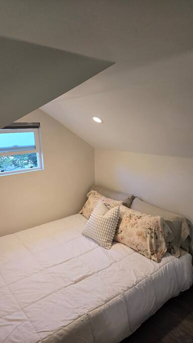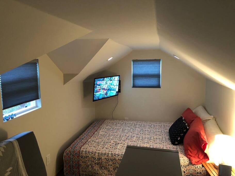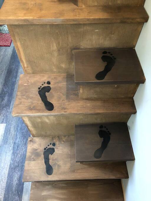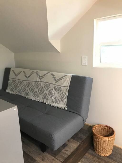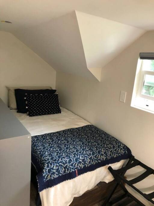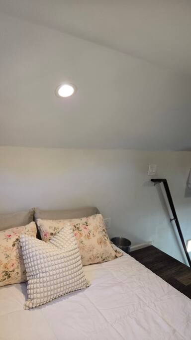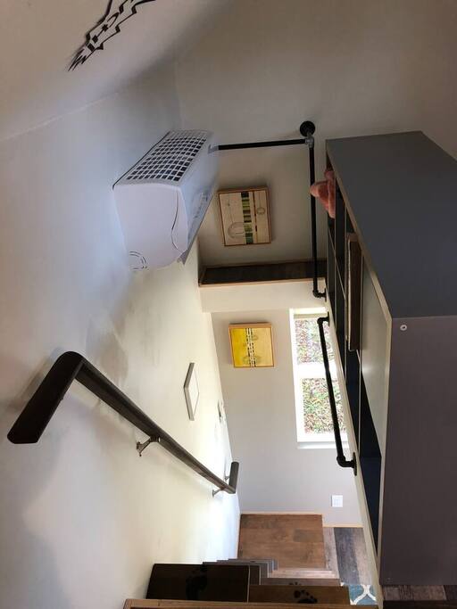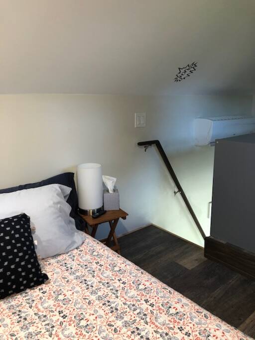 This is a small guest house that is 8 x 15' . The loft ceiling height ranges from 6 feet to 4 feet. The stairs are what they call an Alternating Tread Device, often used on ships and warehouses. The property is shared with the main house and a guest house.