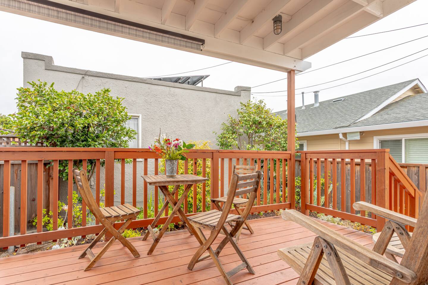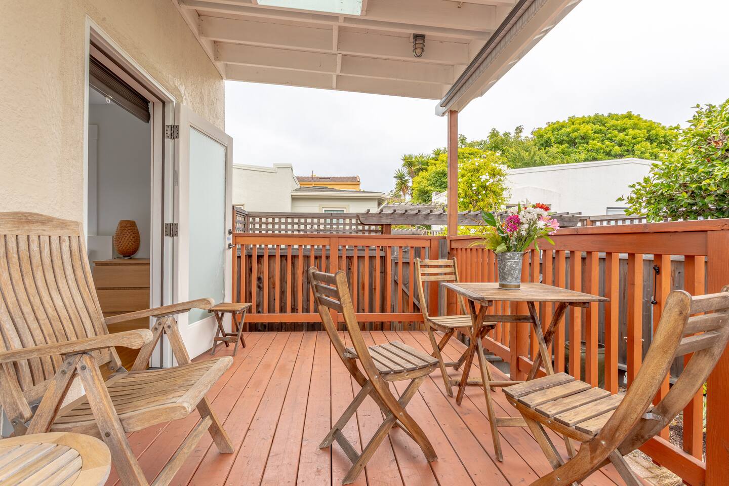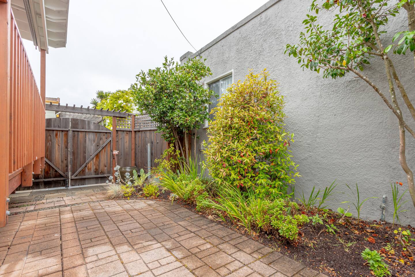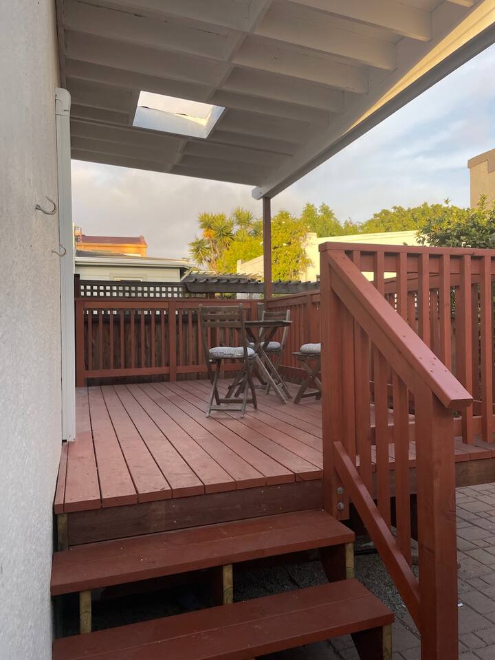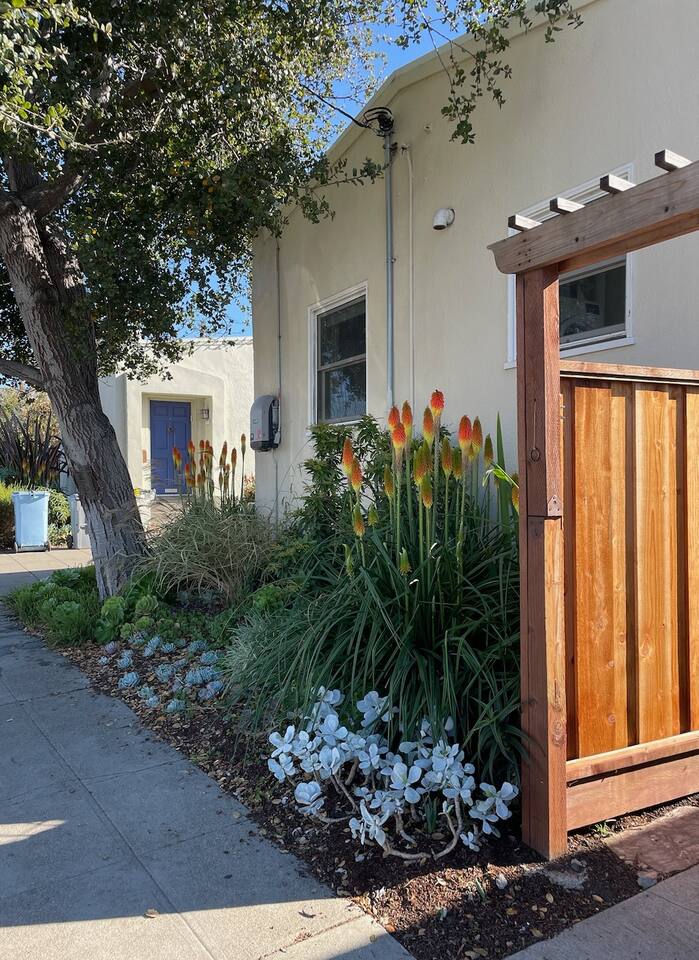 A traditional Berkeley stucco house with a deck and small patio in a residential neighborhood. The house is part of what they call a pocket neighborhood, having a common driveway shared by 5 other houses and great neighbors. A breakfast nook, fully equipped kitchen. Bedroom door leads to your private deck, patio and garden.